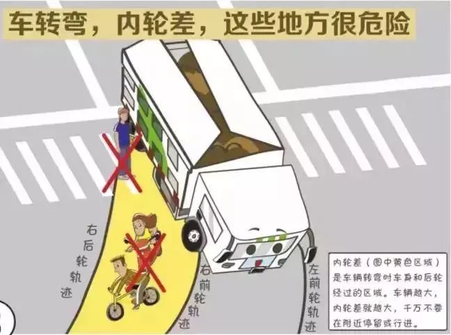 当泥头车左转、右转时,内前轮转弯半径与内后轮转弯半径之间必然存在差距,这个差距我们称为内轮差,这个位置也系司机的盲区,引发事故的几率相当高。