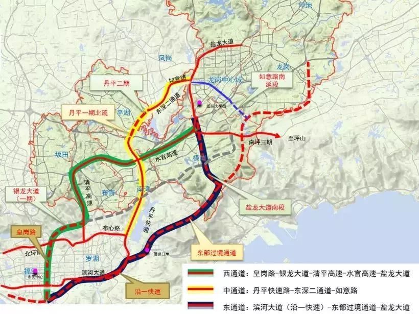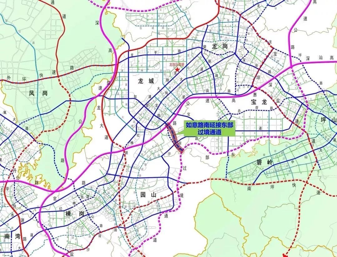 如意路南延接东部过境通道段将作为东部战略通道东通道的重要补充通道,通过如意路南延接东部过境通道可进一步改善龙岗中心城与香港、市中心的便捷、快速联系。