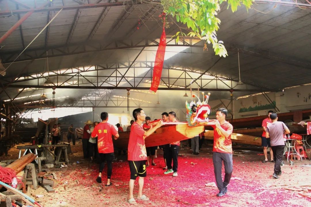 开龙口、装龙头、放冚板、点睛、采青……入水仪式每一个环节都是庄重的,饱含着传统民俗文化中祈求平安、顺利的美好寓意。随着鞭炮声,新龙下水。华阳村龙舟队员们铆足了劲,齐心协力抬起新龙舟,缓缓地把龙舟放到河面,开启归家之路。