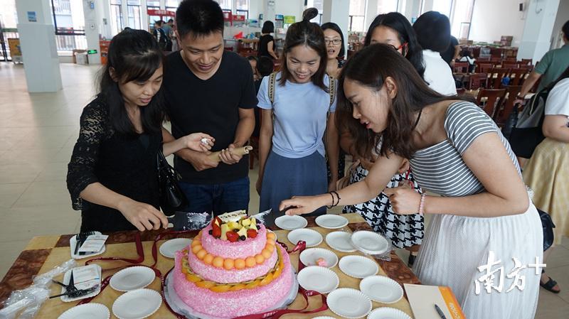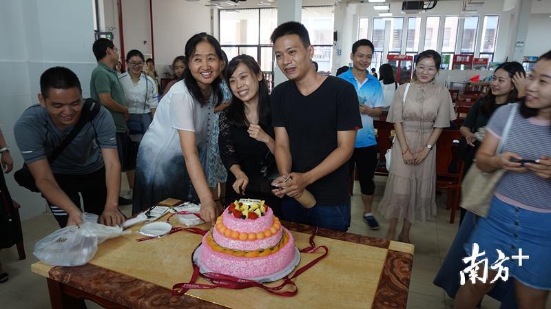 得知这一喜讯后,省实珠海学校执行校长周映平悄悄为这对新人定制了新婚蛋糕,让在场所有人一起分享这份喜悦,也为新人送上祝福。
