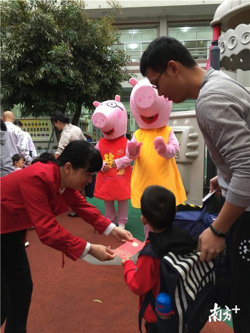 一大早,园长妈妈和老师们便在园门口给孩子们发利是,人手一份。红包外形是粉色小猪造型,很是呆萌,里面装了一枚金牌朱古力,孩子们爱不释手。