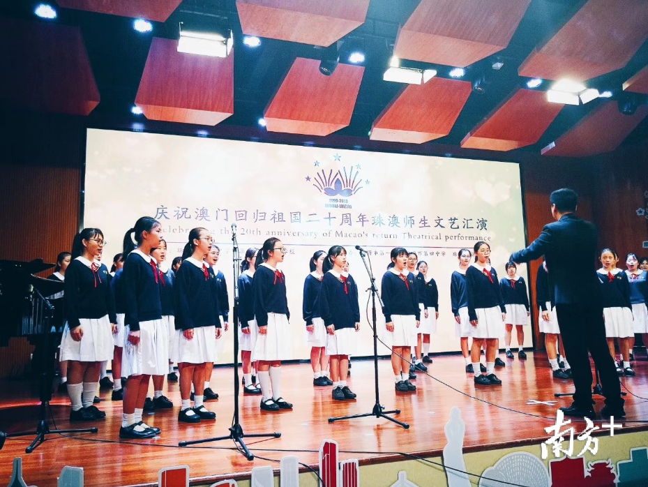 为庆祝澳门回归祖国20周年,10日下午,珠澳两地五所学校师生在珠海市第三中学(简称“珠海市三中”)欢聚一堂,共同参与观看一场精彩纷呈的文艺汇演。在珠澳师生的演绎下,整场文艺汇演尽洒激扬青春,格外朝气蓬勃,不时引得台下掌声连连。