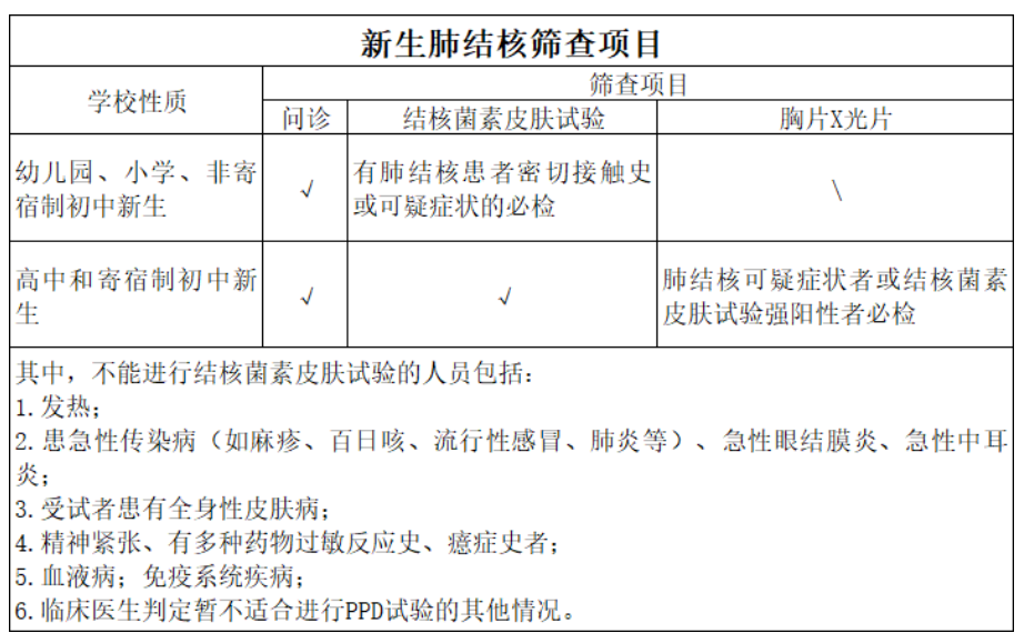 2.高中和寄宿制初中新生:进行肺结核可疑症状筛查和结核菌素皮肤试验(PPD试验),对肺结核可疑症状者和PPD试验强阳性者进行胸部X光片检查;