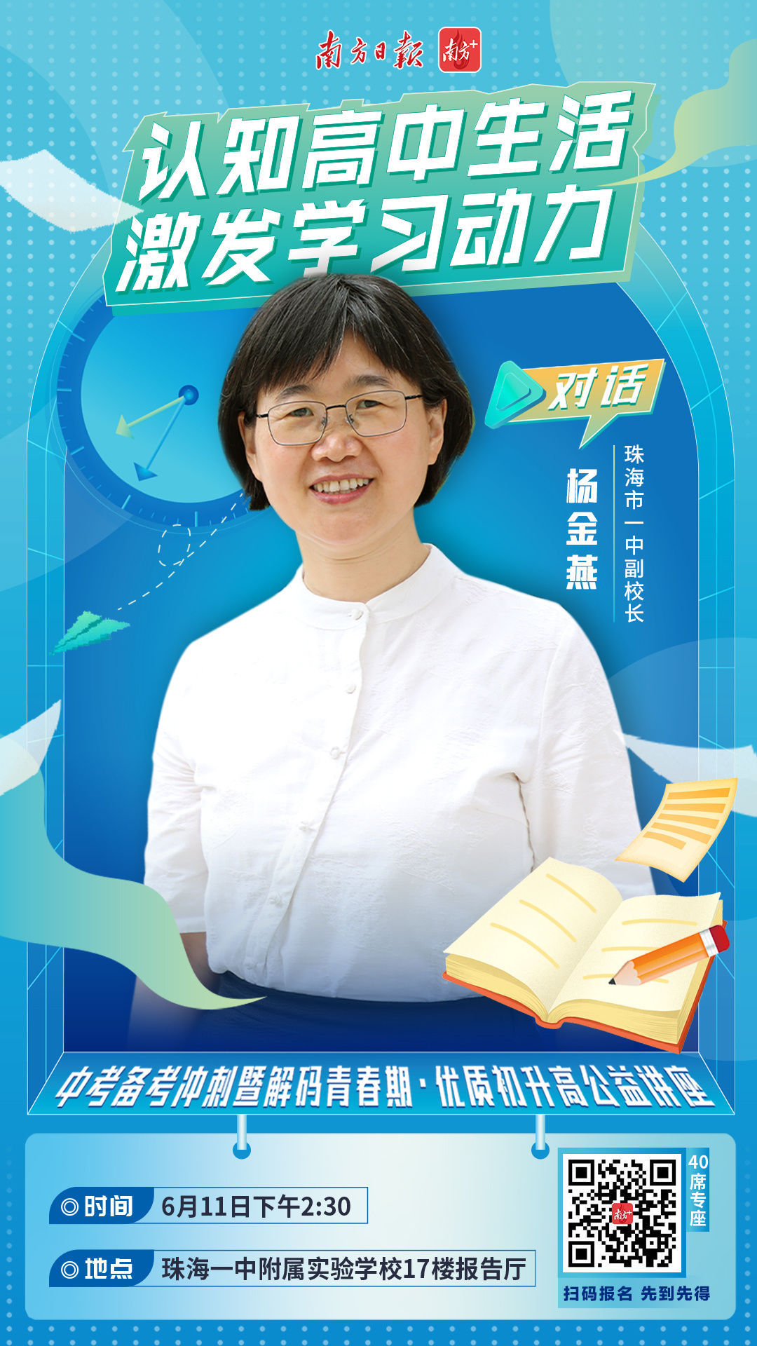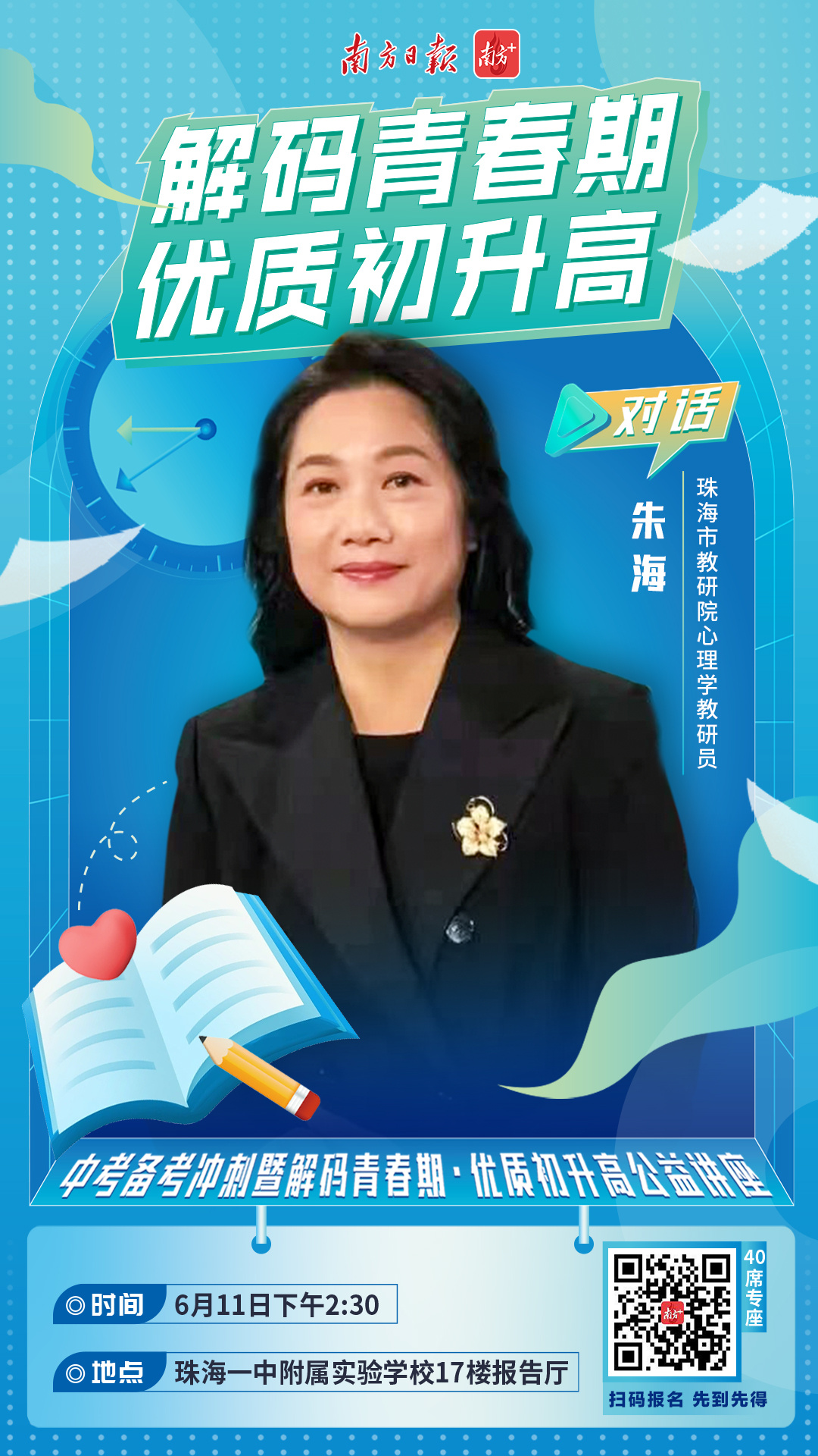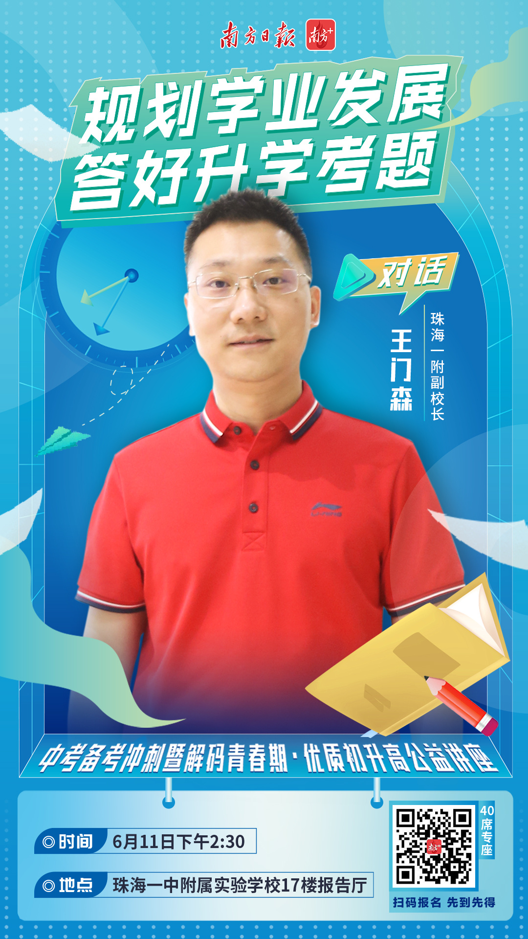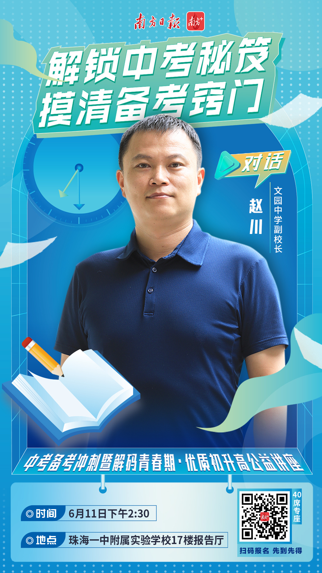 2022年6月11日下午2时30分,南方报业传媒集团珠海分社、珠海一中附属实验学校将联合举办“『对话名师』——中考备考冲刺暨解码青春期·优质初升高”公益讲座活动。
