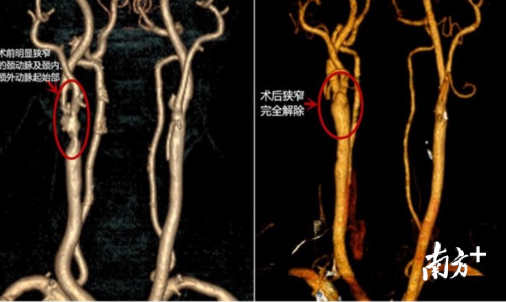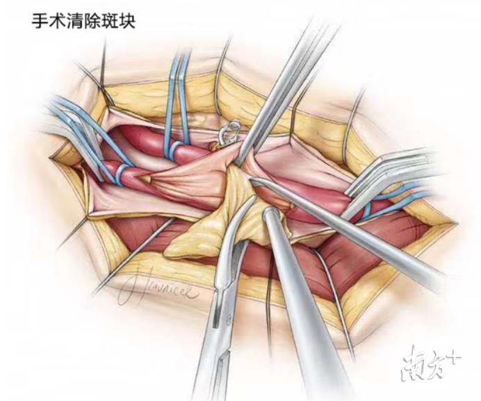 “手术好像脱袜子一样将颈动脉的外膜翻开,显露并切除病变的内膜,清除堵塞血管的‘垃圾’。打开堵塞的血管,使颈动脉的内壁光滑、内径恢复正常大小,脑血管得以疏通,有效改善了脑供血不足的情况,同时切断了栓子产生的来源,然后再将外膜缝合到原来的位置上。”李刚表示,患者术后未出现并发症,恢复顺利,术前的不适症状得到明显改善,已从ICU转入普通病房,不久便可痊愈出院。