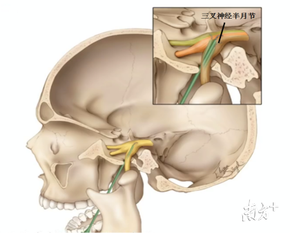 三叉神经是颅内最大的脑神经,主要支配额部、脸部、口腔的感觉及咀嚼肌的运动。三叉神经痛的发病原因与血管压迫有关,随着年龄增长,血管的弹性会下降,血管袢程度增加,神经压迫加重,当神经压迫到一个临界点就会诱发三叉神经痛。