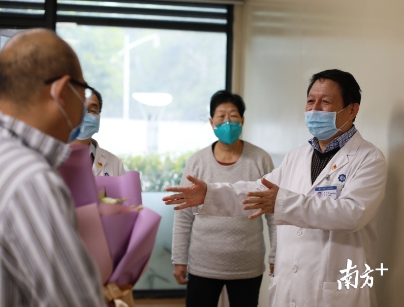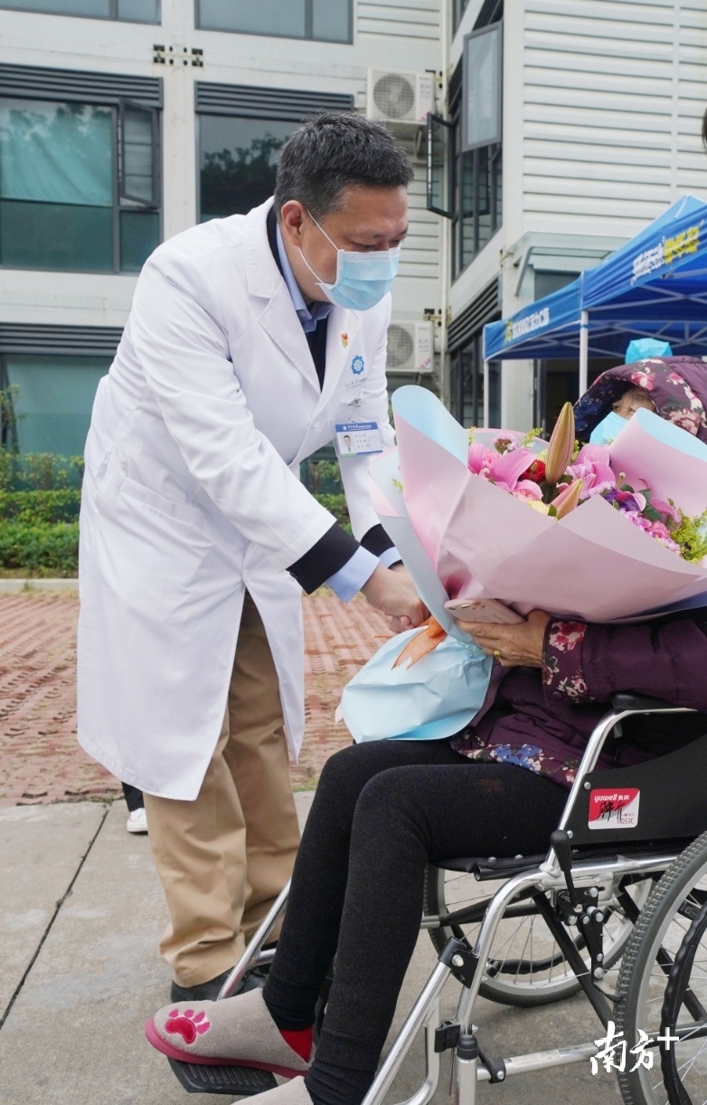 治疗期间,该名76岁高龄的危重患者一度病危,医生日夜守护、全力救治,把她从鬼门关上救了回来。图为中山大学附属第五医院单鸿院长为患者送上鲜花和祝福。