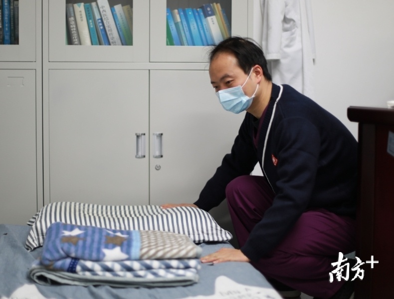 在抗击新冠疫情中,医院成了他的家,他常常睡在办公室的一张简易折叠床上。因要随时待命,他都是和衣而睡。图为他放在办公室的“折叠床”。