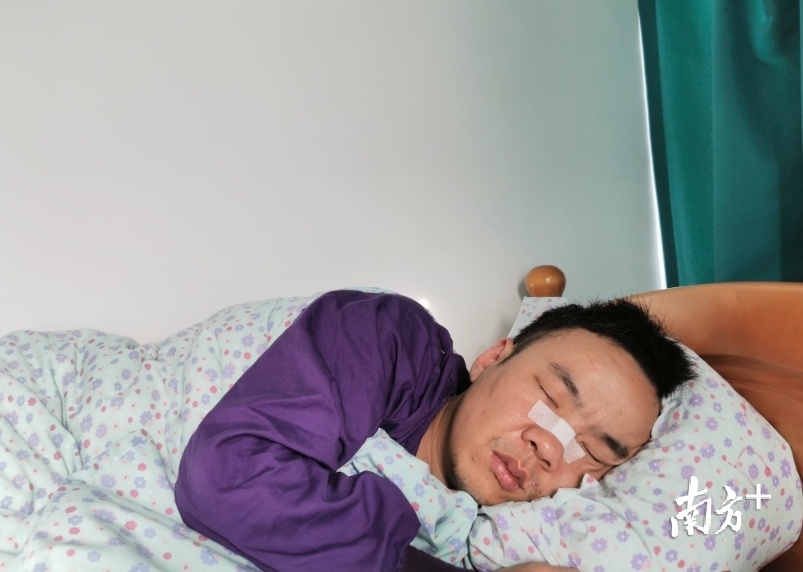 中大五院心血管病中心医生李松彪,新冠疫情期间在医院感染呼吸ICU负压病房与同事们一起轮值,进仓守护病患图为他从仓内出来后休息,鼻梁上的创可贴意味着他多次进仓守护患者,已就被防护设备压伤了。