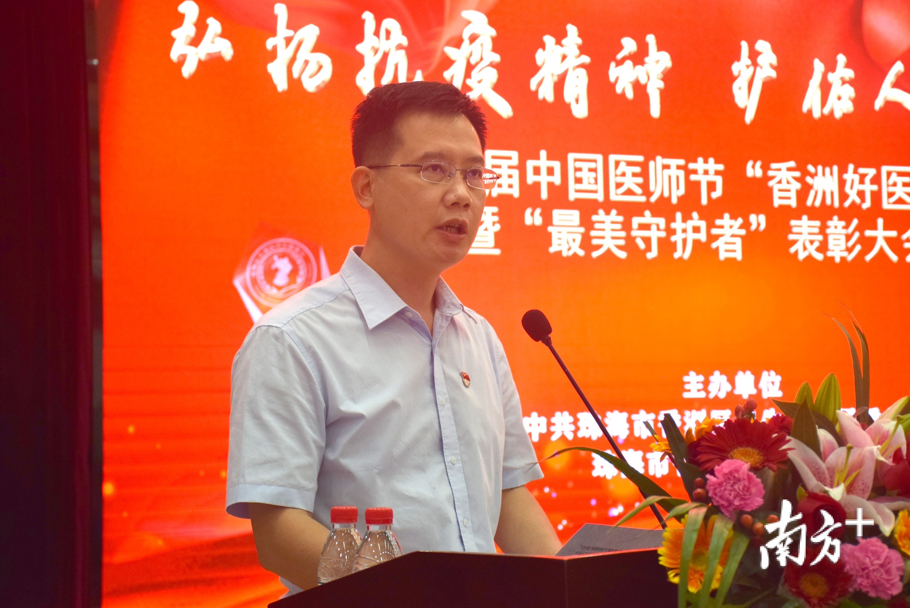 香洲区卫生健康局局长胡文锋在致辞中代表香洲区卫生健康局党委向受到表彰的先进个人表示热烈的祝贺,向广大医务工作者致以节日问候。他表示,跨越严冬至酷夏,广大医务工作者英勇无畏,怀揣“医者仁心”的职业信仰,坚持生命至上,始终冲在疫情防控最前沿,展现救死扶伤的天职。“希望广大医务工作者以先进为榜样,牢记初心使命,用仁爱之心、精湛医术,践行“敬佑生命、救死扶伤、甘于奉献、大爱无疆”的职业精神,继续当好守护人民健康的忠诚卫士,为推动“健康香洲”事业作出更大贡献。