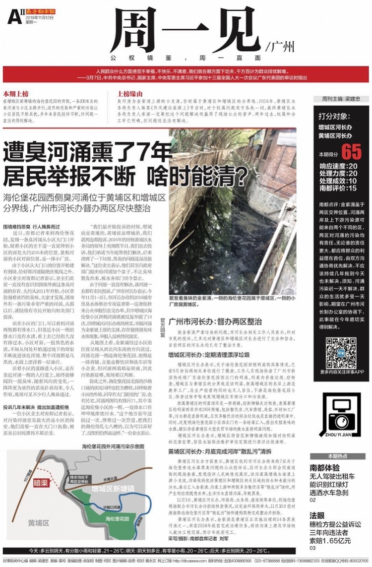 11月12日,南都《周一见》报道了海伦堡花园旁边跨界河涌金紫涌长期黑臭,影响小区居民生活(详见《遭臭河涌熏了7年 居民举报不断 啥时能清?》),引起各方高度关注。