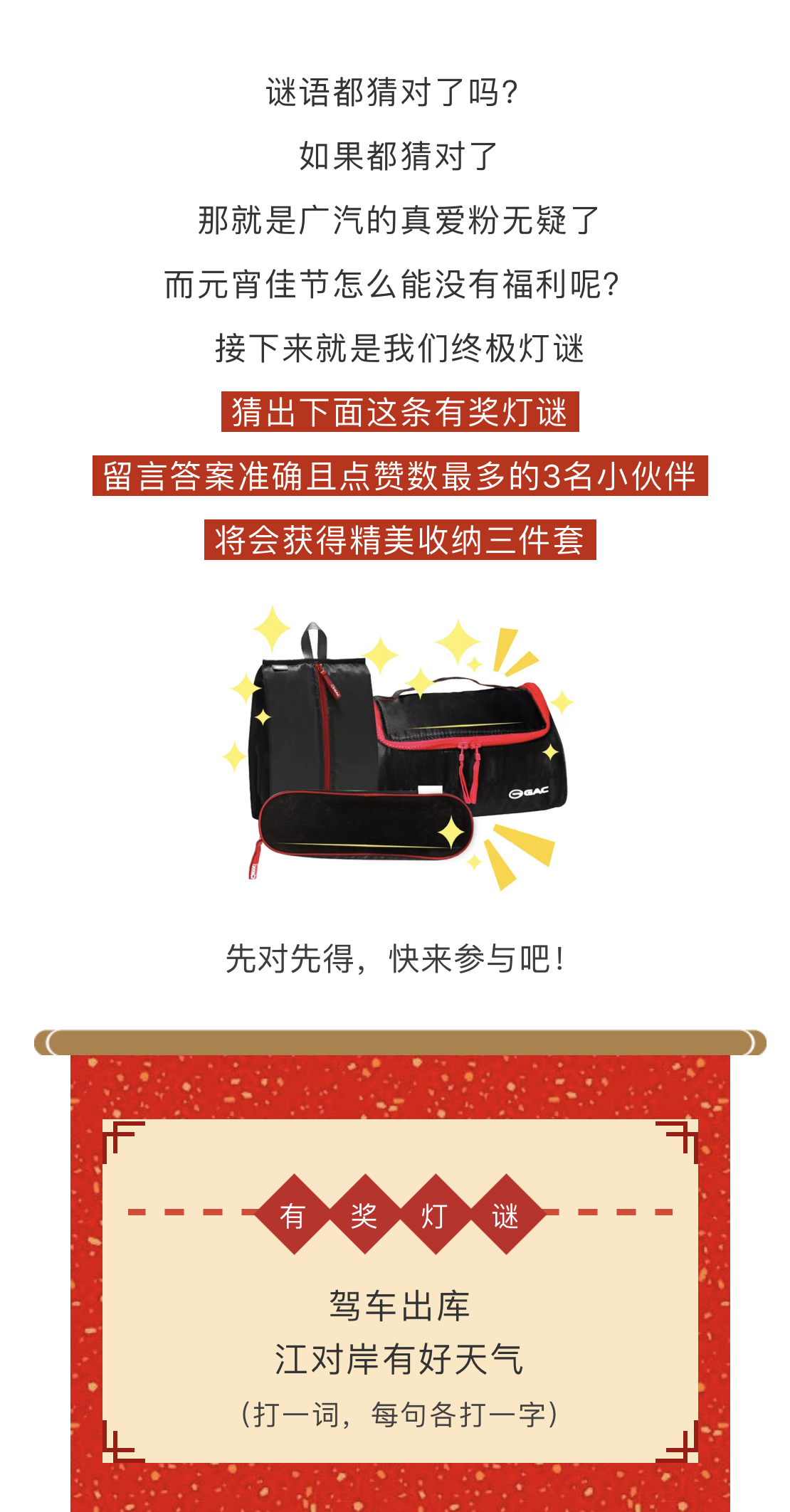 广汽集团也祝大家元宵节快乐,并出了不少灯谜让大家猜,谜底都是广汽的车型。