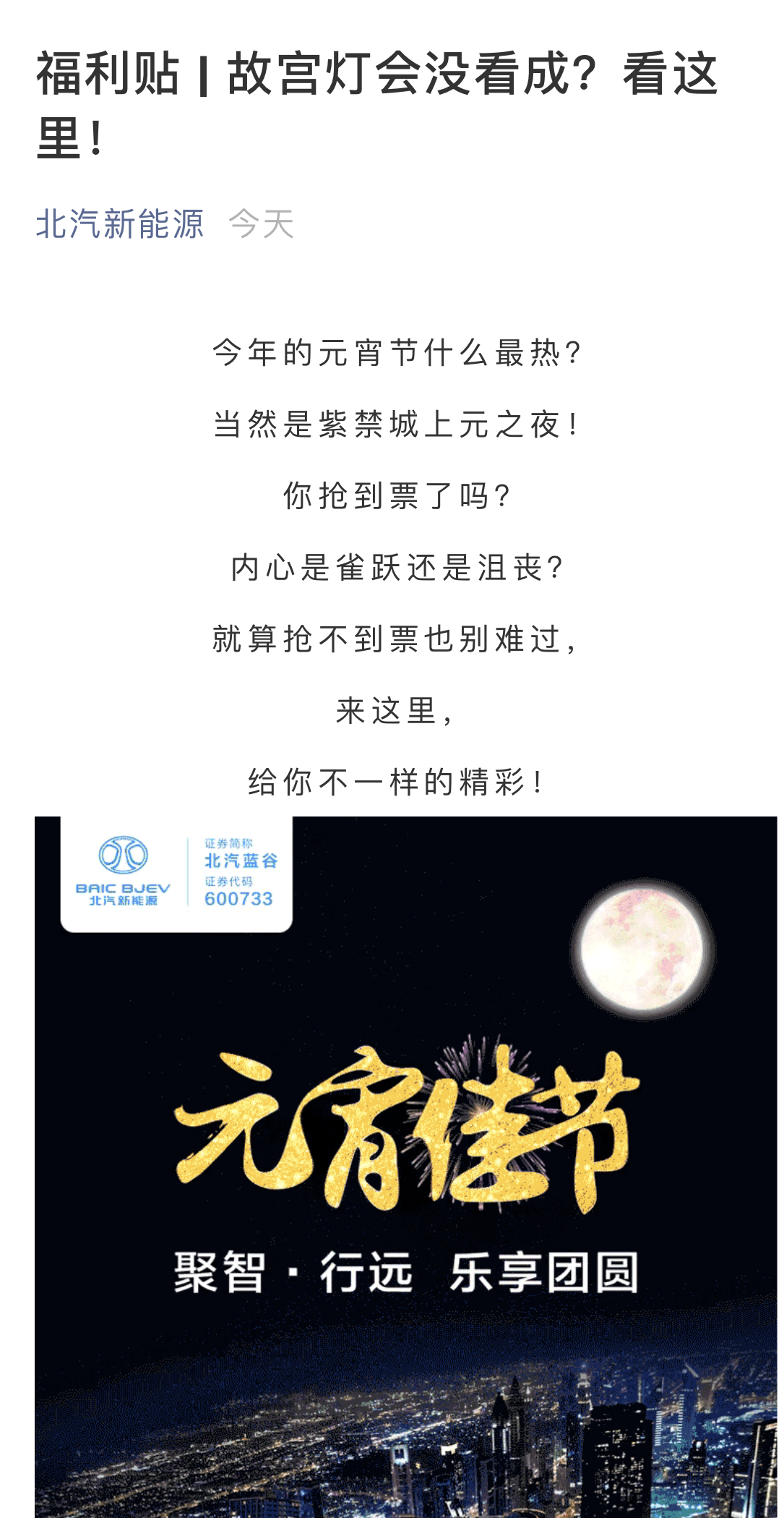 北汽新能源更是搭上紫禁城上元之夜热点,就算抢不到票,也可以让ex5伴着家人陪你一路观灯,一路欢笑。