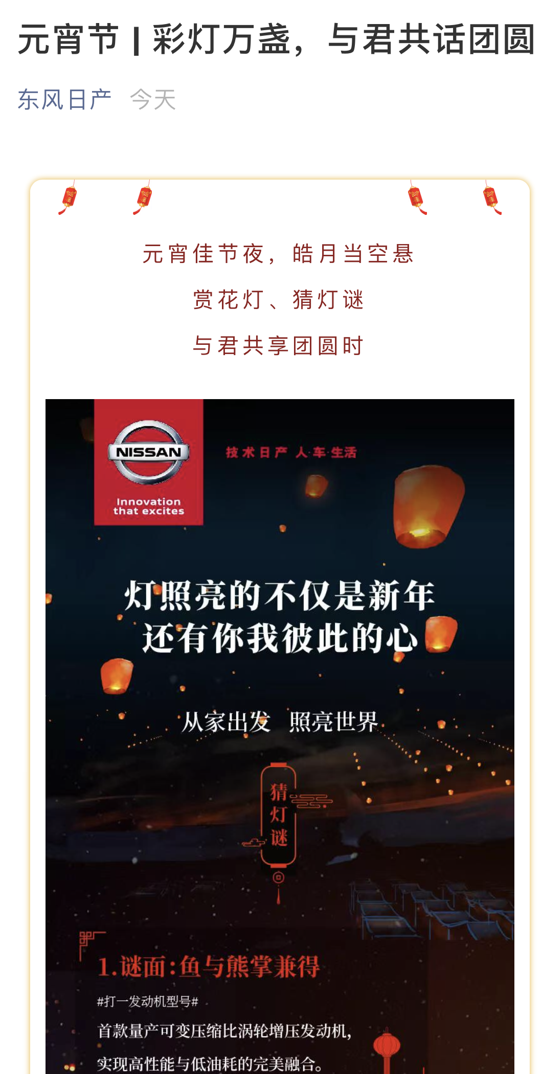 又是一年一度元宵节,今天过去“年”就彻底结束啦!爱车的朋友们吃汤圆或元宵了吗?今日,不如约上三五车友,共品元宵赏花灯,一边赏月一边线上参加车企的趣味活动。有车,随时随地随享团圆。快来看看车企给你的元宵节祝福和精彩活动吧!