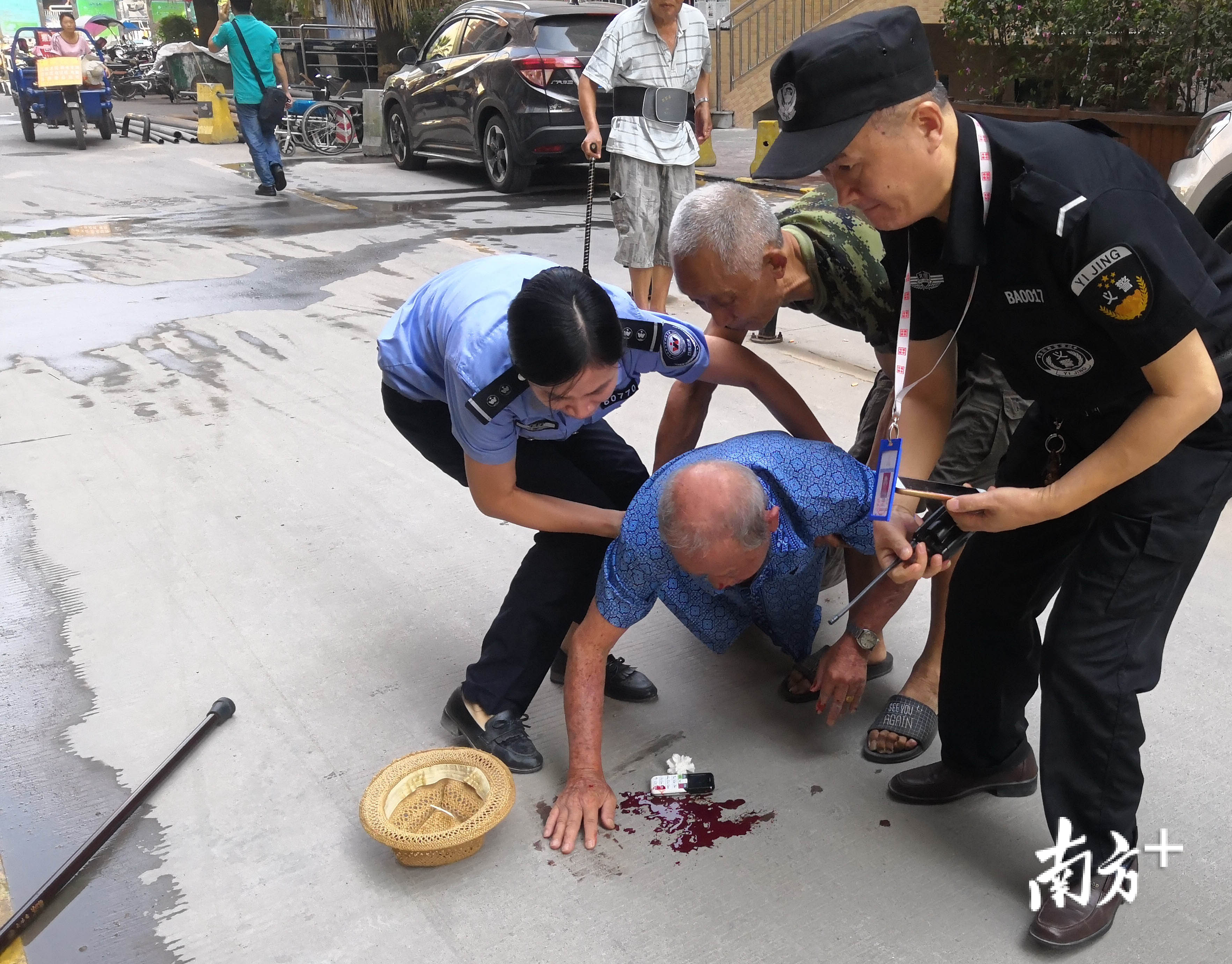 10月1日上午9点10分,深圳市宝安区西乡街道流塘网格中队网格员唐燕和同事李春芳在流塘社区流塘新村开展安全巡查时,发现流塘新村一巷附近路面一名身着蓝色衬衫的老人摔倒在地,口鼻多处受伤,地上一摊血迹,老人表情十分痛苦。