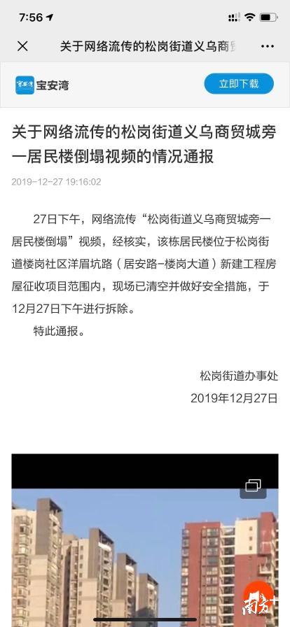 12月27日晚,宝安区松岗街道办事处发布通告,27日下午,网络流传“松岗街道义乌商贸城旁一居民楼倒塌”视频,经核实,该栋居民楼位于松岗街道楼岗社区洋眉坑路(居安路-楼岗大道)新建工程房屋征收项目范围内,现场已清空并做好安全措施,于12月27日下午进行拆除。