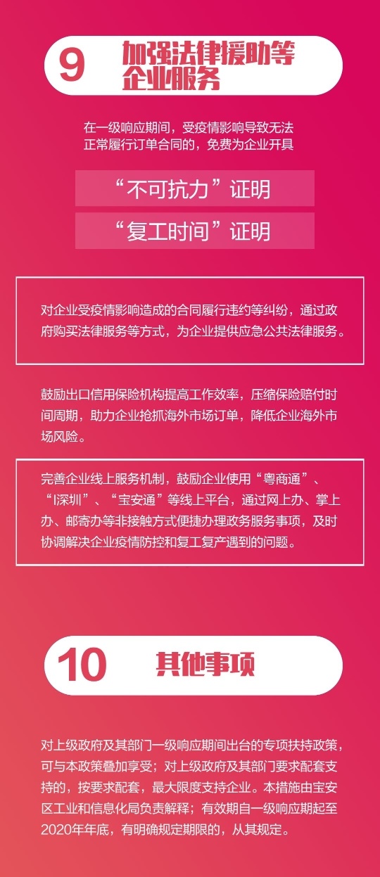 记者看到,“撑企十条”进口宝安商事主体多、产业园区多、产业工作者多等几大特点,突出强调企业、园区的防控主体责任,强化复工指导力度;加强政府杠杆调节作用,引导社会各界支持复工复产;细化补充深圳“暖企16条”,给予企业更多实实在在的支持。