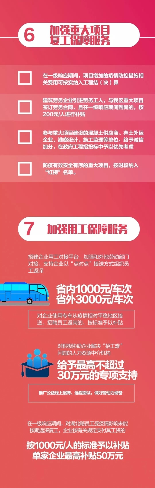 一是加强我区和外地劳动部门对接,支持企业以“点对点”方式组织员工返深,减少员工来深路途的感染风险,对企业使用专车从疫情相对平稳地区接送、招聘员工返岗的,按省内1000元/车次、省外3000元/车次的标准给予补贴。