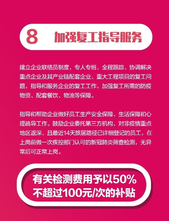 针对目前企业大量员工返深待岗的情况,《若干措施》规定,鼓励企业委托第三方机构,对非疫情重点地区返深、且最近14天旅居路径已经详细登记的员工,在上岗前做一次新冠肺炎筛查检测(检测方式需经疾控部门认可),检测无异常的可正常上岗。按企业检测费用的50%给予补贴,最高不超过100元/次的补贴。