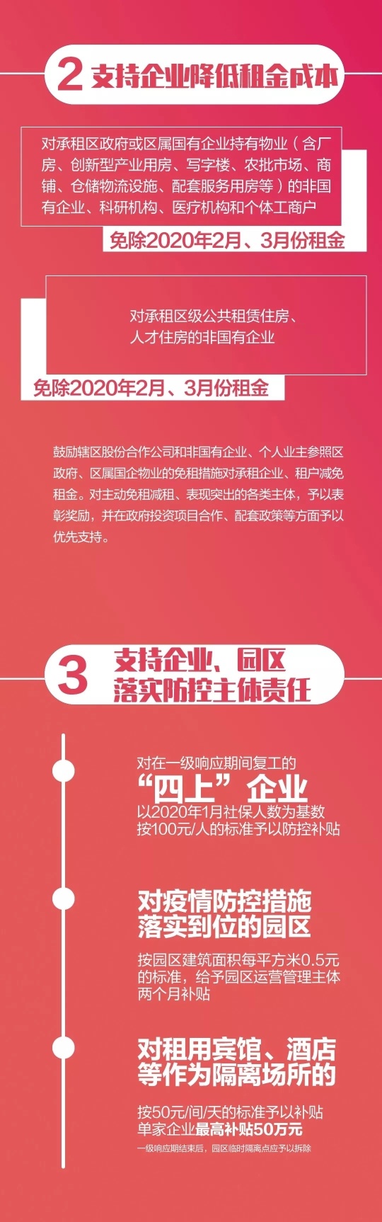 为了落实防控责任,企业应安排独立单元做非疫区返回员工的临时隔离点,企业支出也随之增加。针对此情况,我区一级响应期间,鼓励企业租用酒店、宾馆作为隔离场所,也鼓励园区利用空地搭建临时隔离点,满足隔离要求。对租用宾馆、酒店等作为隔离场所的,按50元/间/天的标准予以补贴,单家企业最高补贴50万元。一级响应期结束后,园区临时隔离点应予以拆除。