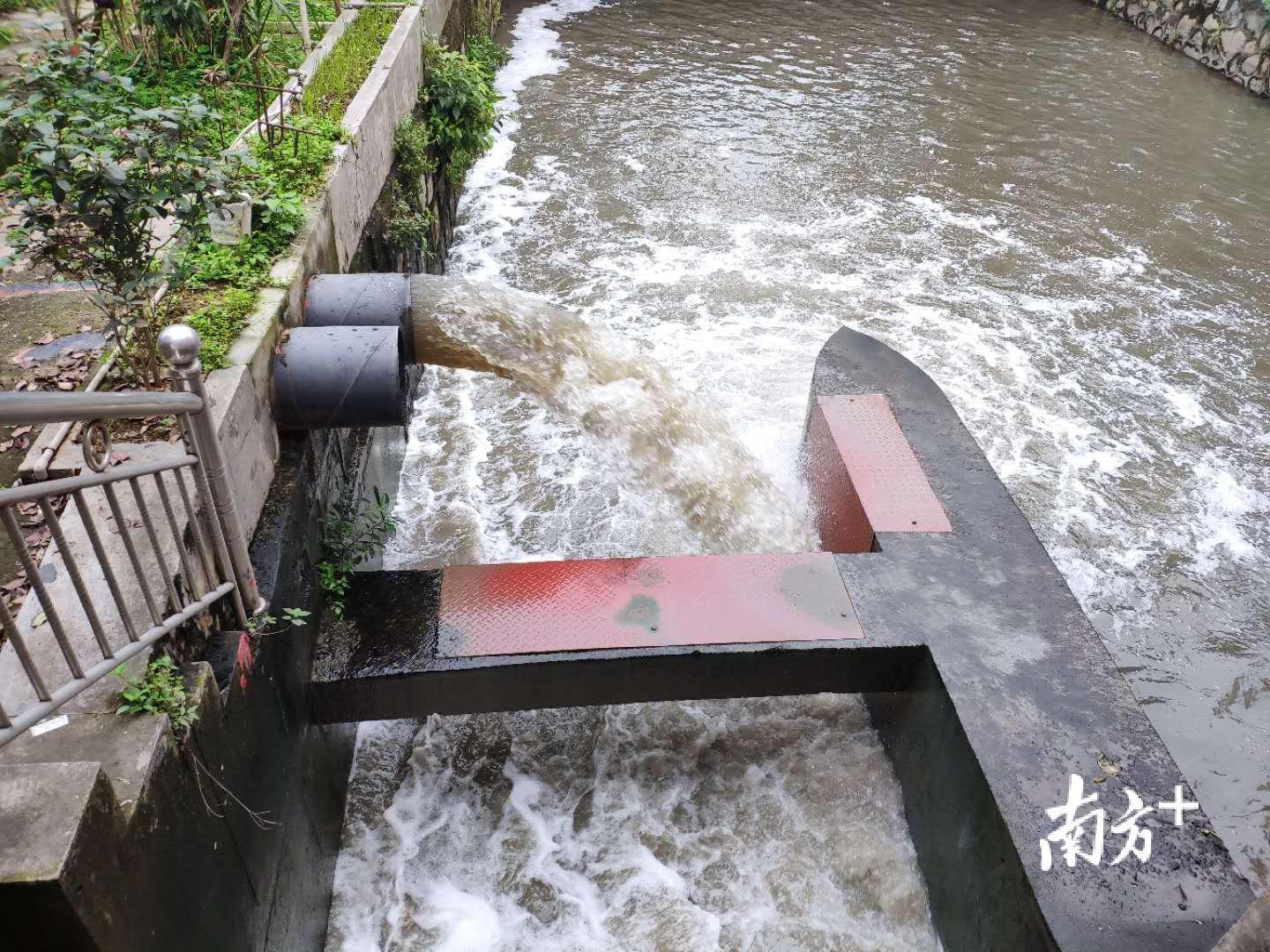 大山西涌富丽居委段村级河长赵伟军表示,黑水是上游洗管洗井工作所排。今年2月,河长巡河时发现,上游存在多处漏排污口,处理漏排污口重建管网需要青瓦淤泥,冲洗暗井暗管,由此产生了一些黑水,并非污水。此外,为给渠箱清污分流创造安全的施工条件,河涌水位需长期保持在0.2米的低水位,而河涌的日常水位则超过1米,特于近期在水闸处增加水泵强排。