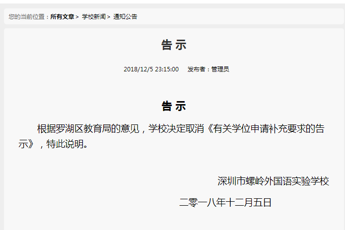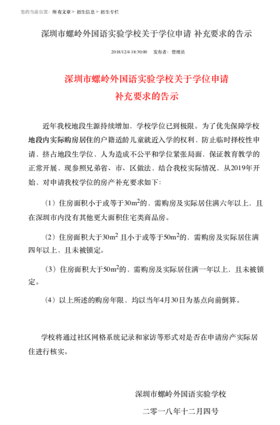 据了解,12月4日,深圳市螺岭外国语实验学校发布关于学位申请补充要求的告示,称因学校学位已到极限,为了优先保障学校地段内实际购房居住的户籍适龄儿童就近入学的权利等,对申请该校学位的房产补充了一系列要求。
