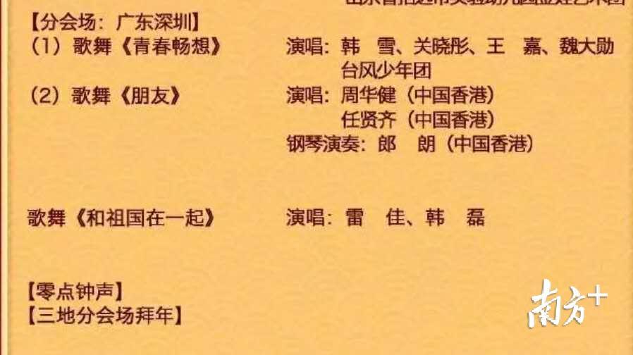 这一台晚会将在7分钟内呈现两个歌舞表演,第一个曲目为《青春畅想》,展现出深圳是座青春之城、活力之城、时尚之城。第二个曲目为《朋友》,展现温暖和成熟的气质,此外,还有零点钟声和三地分会场拜年的环节。
