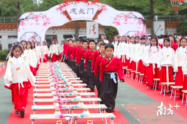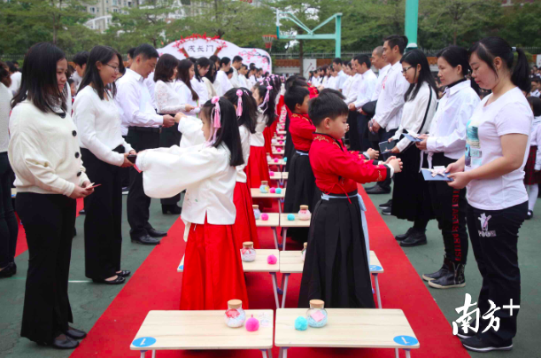 18日,深圳市中小学、幼儿园正式开启新学期,深圳市福田区莲花小学2019年开学季的开学典礼上,为即将步入十岁的三年级学生举行了一场“成长礼”,借此仪式告别童年,感恩立志。整场活动参照古礼要求,充满了仪式感。