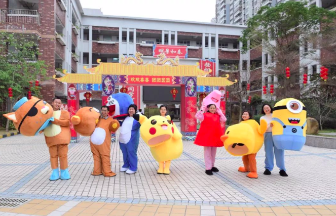 着汉服,敲吉鼓,入福门,拜谢恩师,转身龙狮起舞……这很典雅传统。但还有一些学校,他们迎“佩奇”,派“利是”,送诗集,还包起了汤圆……