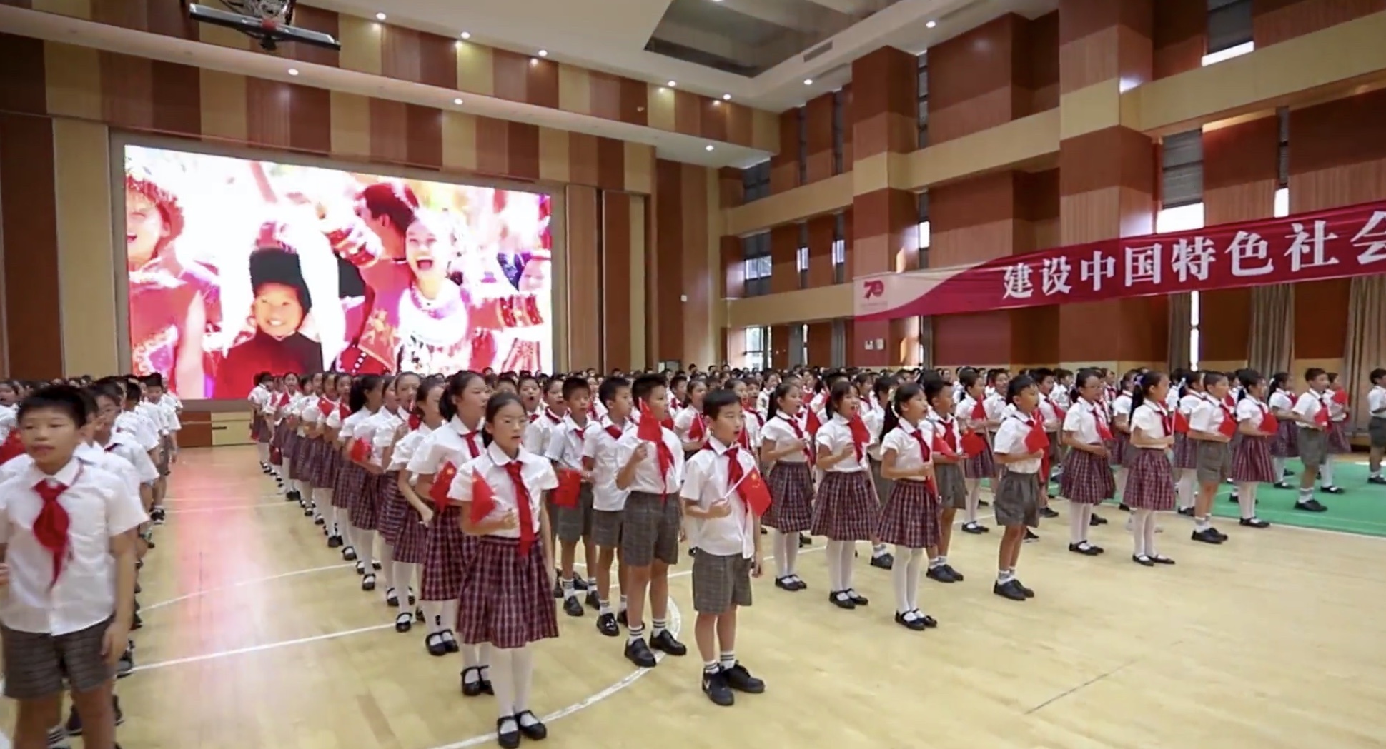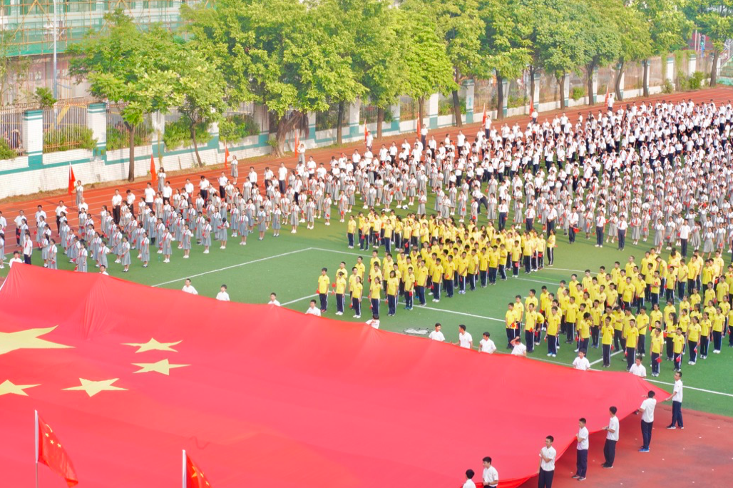 当日上午8时,深圳中学高中部体育馆内,校长朱华伟领唱《我和我的祖国》,同一时间,深圳中学初中部气势磅礴的巨幅五星红旗缓缓现身,44名同学,手持巨幅国旗,高举手臂,从队伍的末端将国旗拉动直至队伍前端,现场瞬间成为了一片旗帜摇曳的红色海洋。