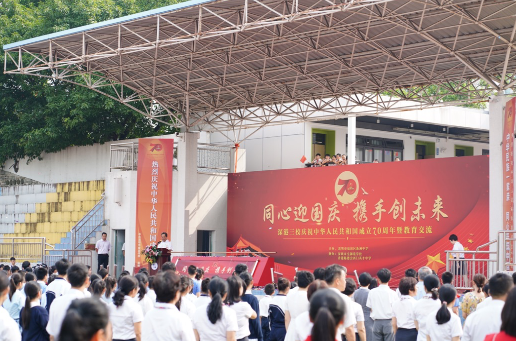 9月27日上午,福田区新洲中学、皇御苑学校、香港路德会西门英才中学三所学校千余名师生齐聚一堂。在新中国成立70周年之际,三校共同迎接中华人民共和国成立70周年庆祝活动暨教育交流活动。