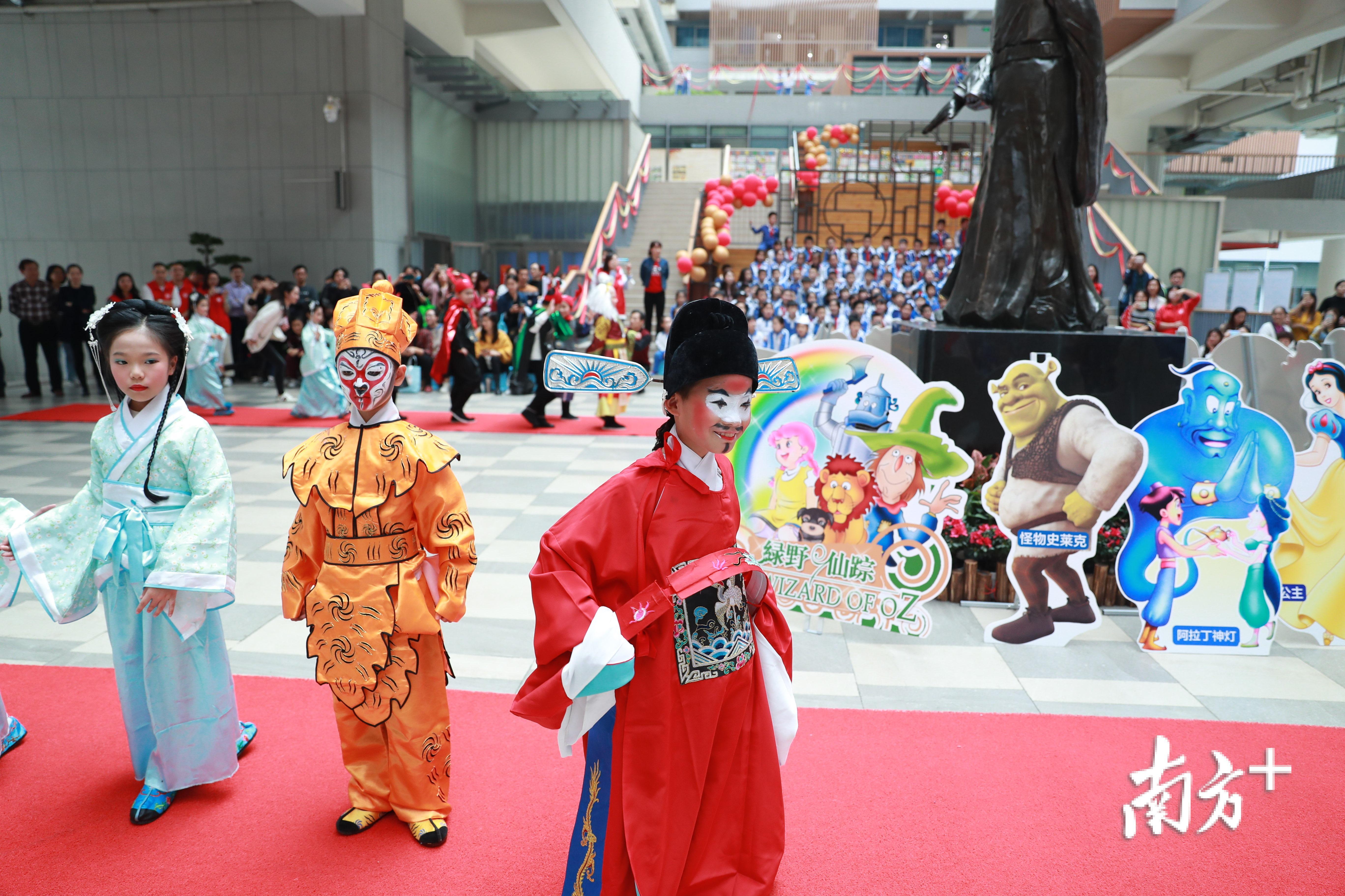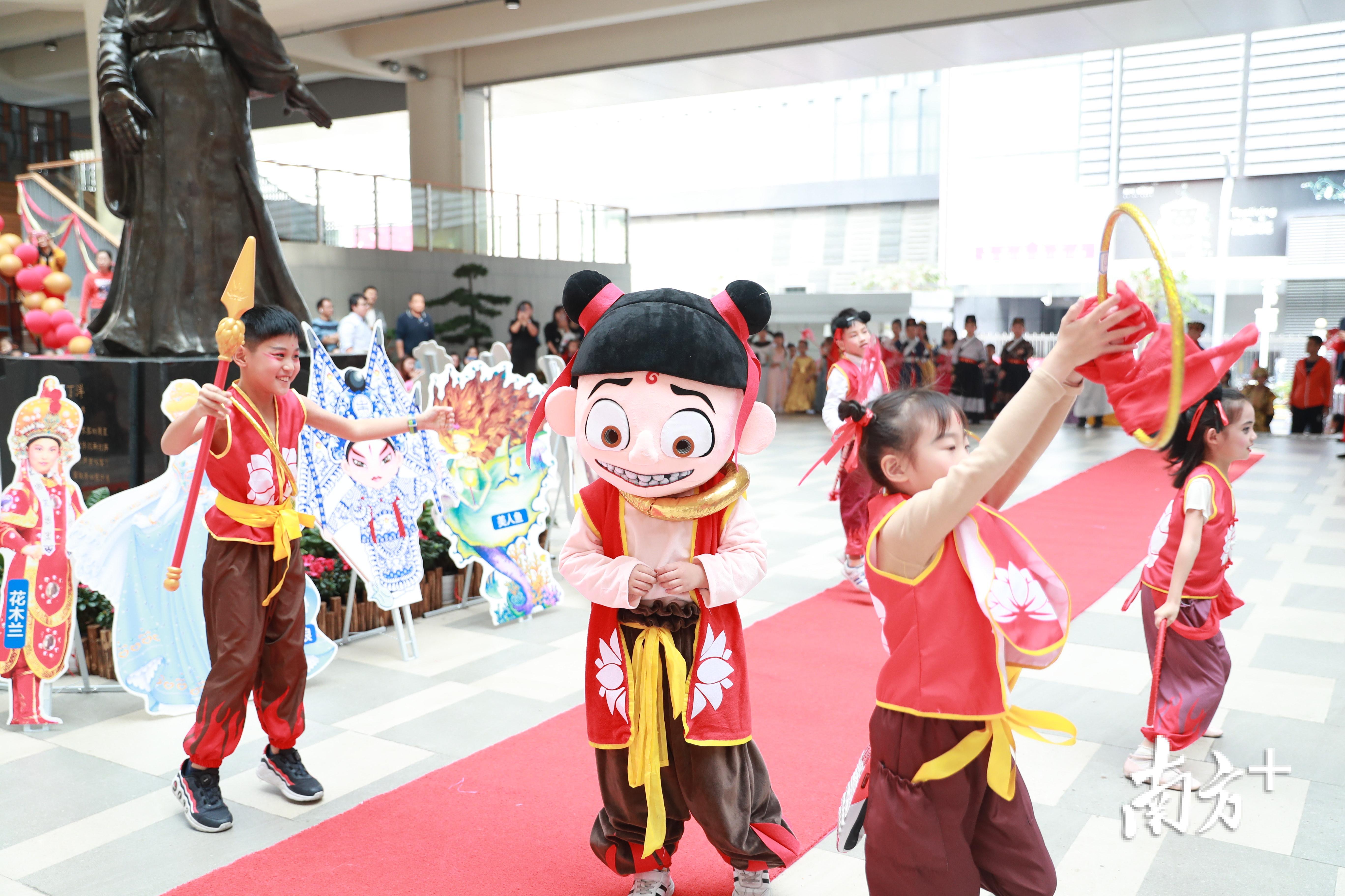 趣味横生的戏剧人物cosplay红毯秀后,活动开幕式的帷幕在正气堂里拉开。好戏一场接一场,压轴的节目是《哪吒闹海》,只见“哪吒”和“敖丙三太子”打得难分难解,宫女水袖表演衣袂飘飘,京剧飞虎旗阵气势磅礴,龙王夜叉入木三分,绘声绘色、活灵活现的小演员们博得满堂喝彩。