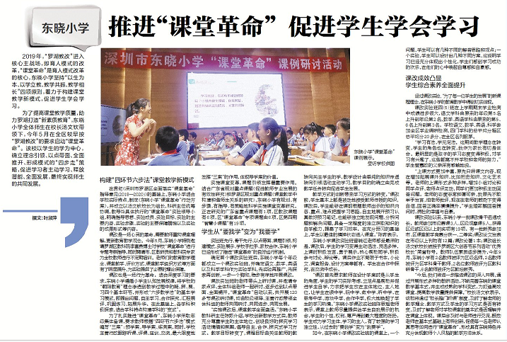 2019年,“罗湖教改”进入核心主战场,即育人模式的改革,“课堂革命”是育人模式改革的核心,东晓小学坚持“以生为本、以学立教、教学共振、教学相长”四项原则,着力于构建课堂教学新模式,促进学生学会学习。