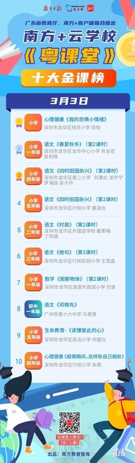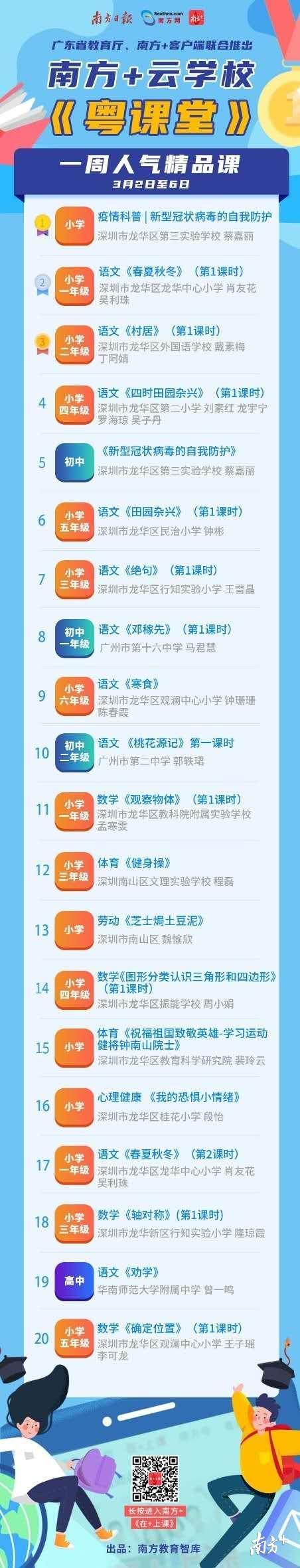在南方+云学校统计的3月2日—3月7日20节人气精品课中,以龙华区教师为代表的深圳老师提供的课程最受欢迎。