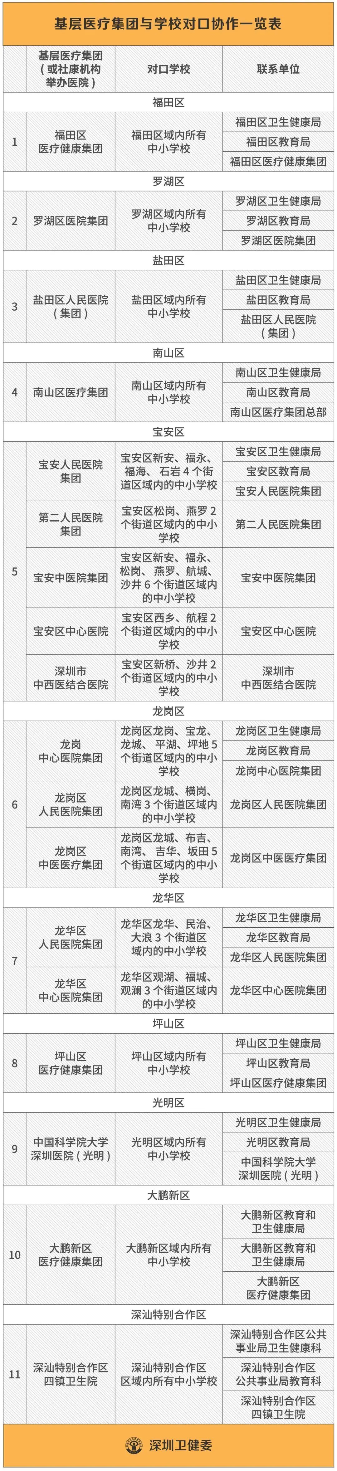 在基层医疗集团与学校对口协作上,福田区医疗健康集团、南山区医疗集团、罗湖区医院集团、盐田区人民医院(集团)、坪山区医疗健康集团、大鹏新区医疗健康集团、中国科学院大学深圳医院(光明)分别对口辖区内的所有中小学校。