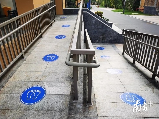 宿舍楼前,学生们踩着蓝色“脚印” 保持安全距离,“刷脸”通关。
