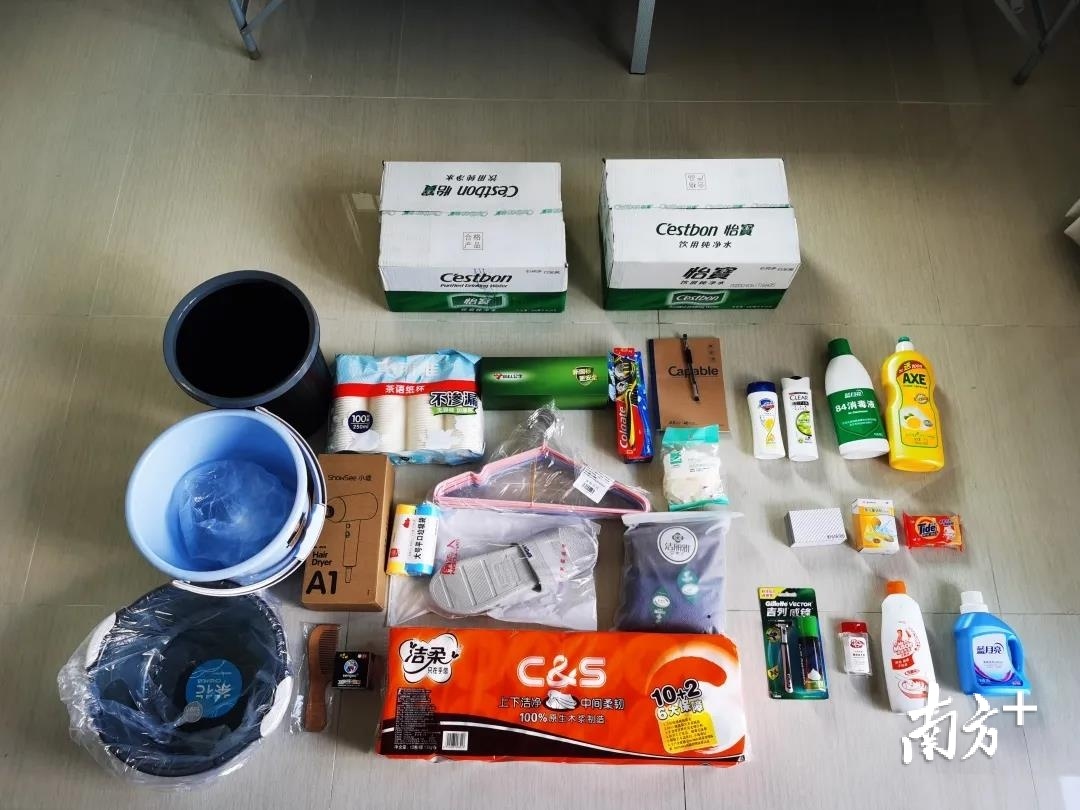 在这里,哈工大(深圳)为入住驿站的学生准备了一份包含“45件套”的“健康包”。洗漱用品、卫生用品,吹风机、笔记本、拖鞋......一应俱全。