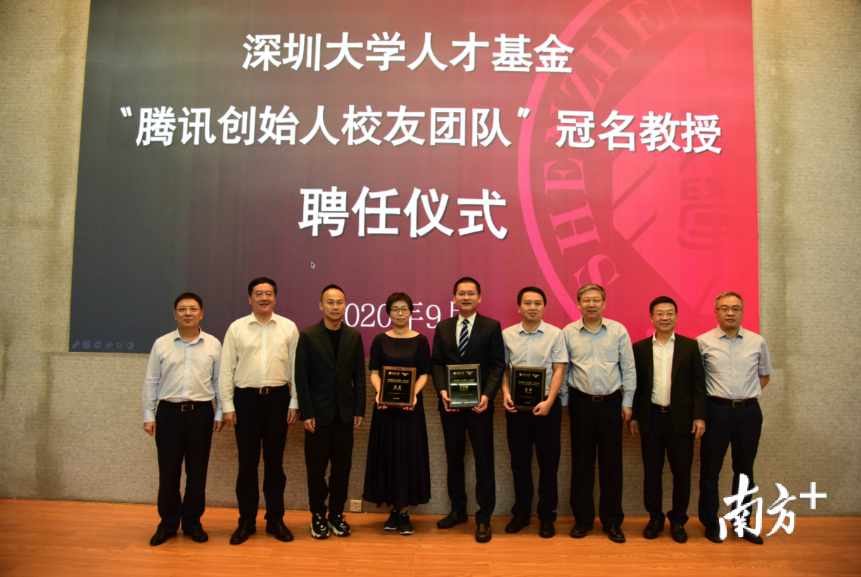 深圳大学15日举行人才基金“腾讯创始人校友团队”冠名教授聘任仪式,首批聘请李霄鹏、饶峰、黄惠三位教授为“腾讯创始人校友团队”冠名教授(特聘),每人每年最高将获30万元人民币资助,资助期限一般为5年。这标志着深圳大学冠名教授制度全面实施。当天,腾讯创始人校友、深圳大学人才基金发起人马化腾、陈一丹分别通过视频致辞。
