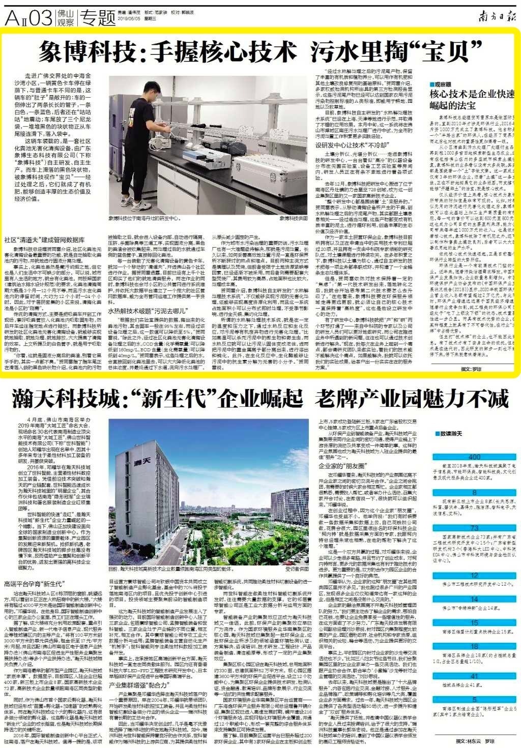 从小区清粪到污水处理厂处理衍生品,再到租1000多亩田地探索新型生态农业,还有在包括佛山在内的多座城市探索土壤修复,象博科技的业务看似没有太多关联,其实都是围绕着一个“土”字做文章。这一家成立仅有3年的环保企业,顺着“土壤”这一条主线,正在不断地拓展它的业务版图,而支撑它能够“开疆辟土”的法宝,就是核心技术。
