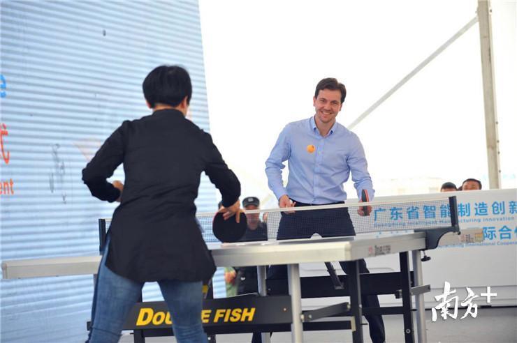 得知能与世界冠军一较高下,现场马上排起了长队,美的集团的乒乓球协会还专门组队过来与波尔一较高下。南方+记者有幸能与他进行了5个球的对决。