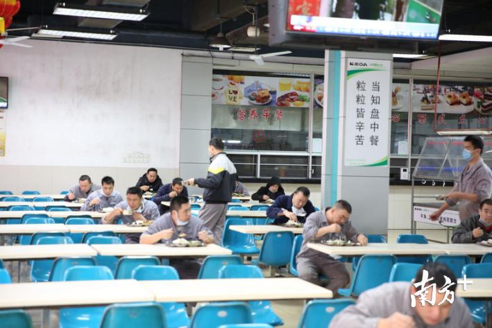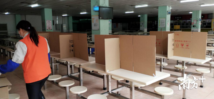 中午时分,到了车间工人吃饭时间,佛山企业各出奇招,通过错峰就餐、隔离就餐等多种方式,尽量避免员工聚集,多家企业饭堂如同高考教室,单人单桌,相隔甚远,几乎无人交流。