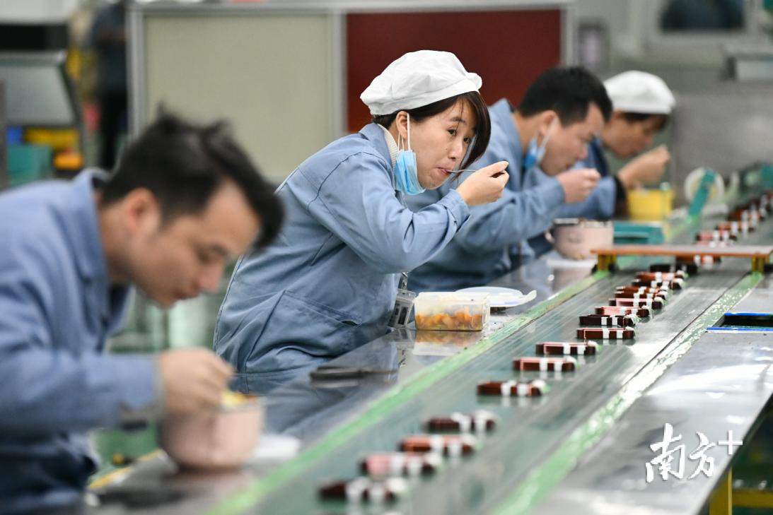 为避免人员集聚,格兰仕取消了员工到饭堂的排队聚餐,由各班组长统一帮每个班组的员工打饭,排队打饭时严格要求每个人必须间隔1米。班组长打包好的午饭分配到各个员工手上,员工在各自工位上吃饭,不聚餐,不聊天。
