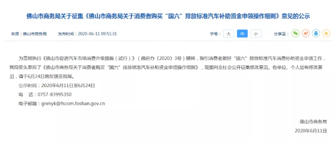 日前,为贯彻执行《佛山市促进汽车市场消费升级措施(试行)》精神,指引消费者申领补助资金,佛山市商务局牵头草拟了《佛山市商务局关于消费者购买“国六”排放标准汽车补助资金申领操作细则》(下称“操作细则”),现面向全社会公开征集修改意见。
