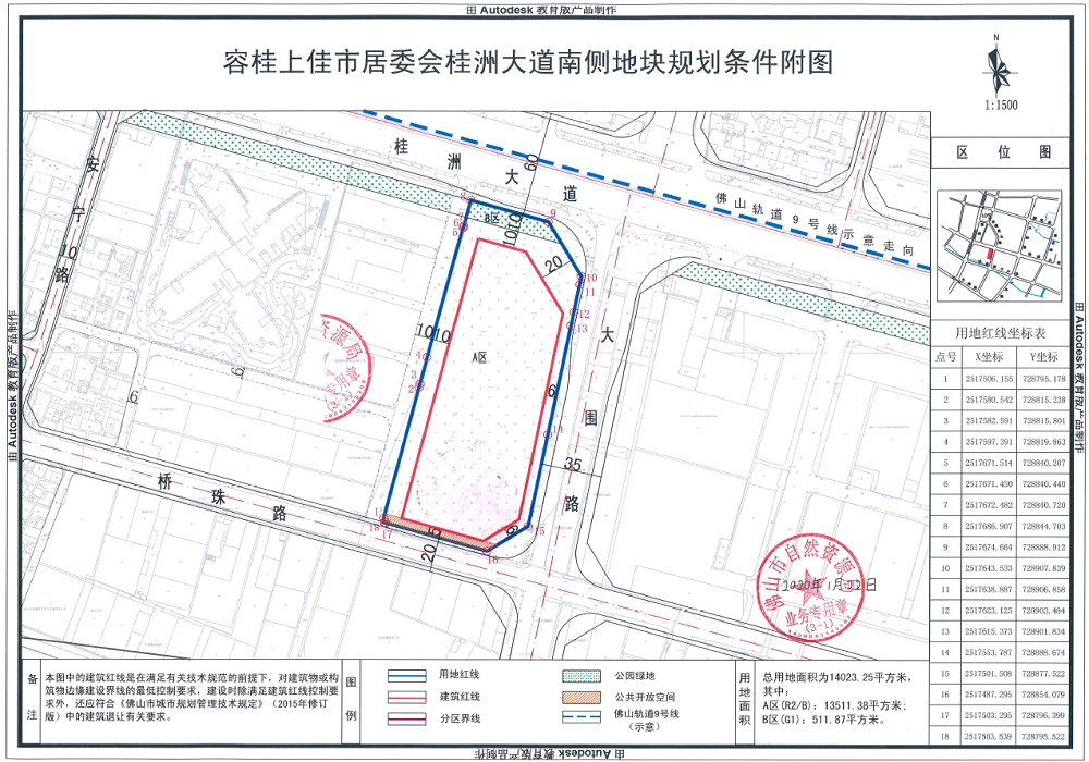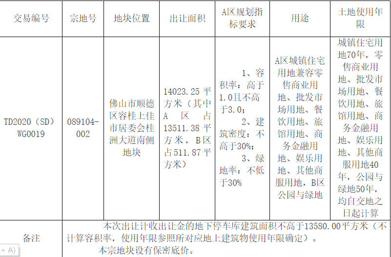 根据出让文件,地块出让面积14023.25平方米,分为A、B两区开发,其中A区面积13511.38平方米,用途为城镇住宅用地兼容零售商业用地、批发市场用地、餐饮用地、旅馆用地、商务金融用地、娱乐用地、其他商服用地,B区面积511.87平方米,A区,B区公园与绿地。地块设置起拍总价2.0673亿元,折合起拍楼面价约5100元/平方米,不设最高限价。
