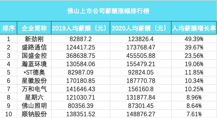 近日,佛山A股上市企业已全部披露2020年年报及报告期内支付给职工的薪酬,南方+记者梳理发现,44家佛山上市公司平均薪酬为13.69万元,其中11家上市公司人均薪酬超过15万元,3家上市公司平均薪酬超过20万元。