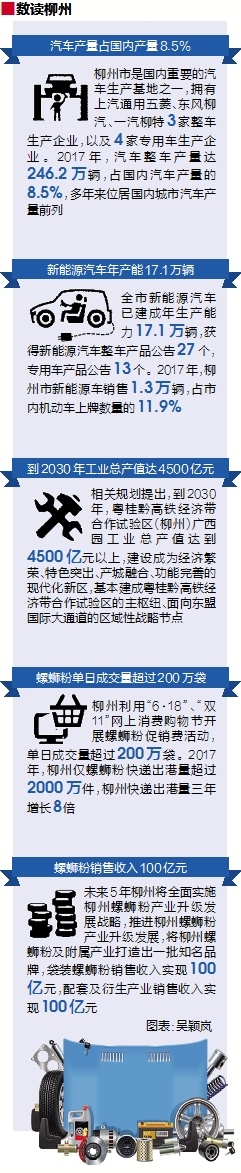 柳州是广西的工业重镇,而汽车是柳州工业的灵魂。整座柳州城,都是一座巨大的汽车城。2017年,该市汽车整车产量达246.2万辆。粤桂黔高铁经济带合作试验区(柳州)广西园所在的柳东新区,正是柳州发展汽车产业的主阵地。