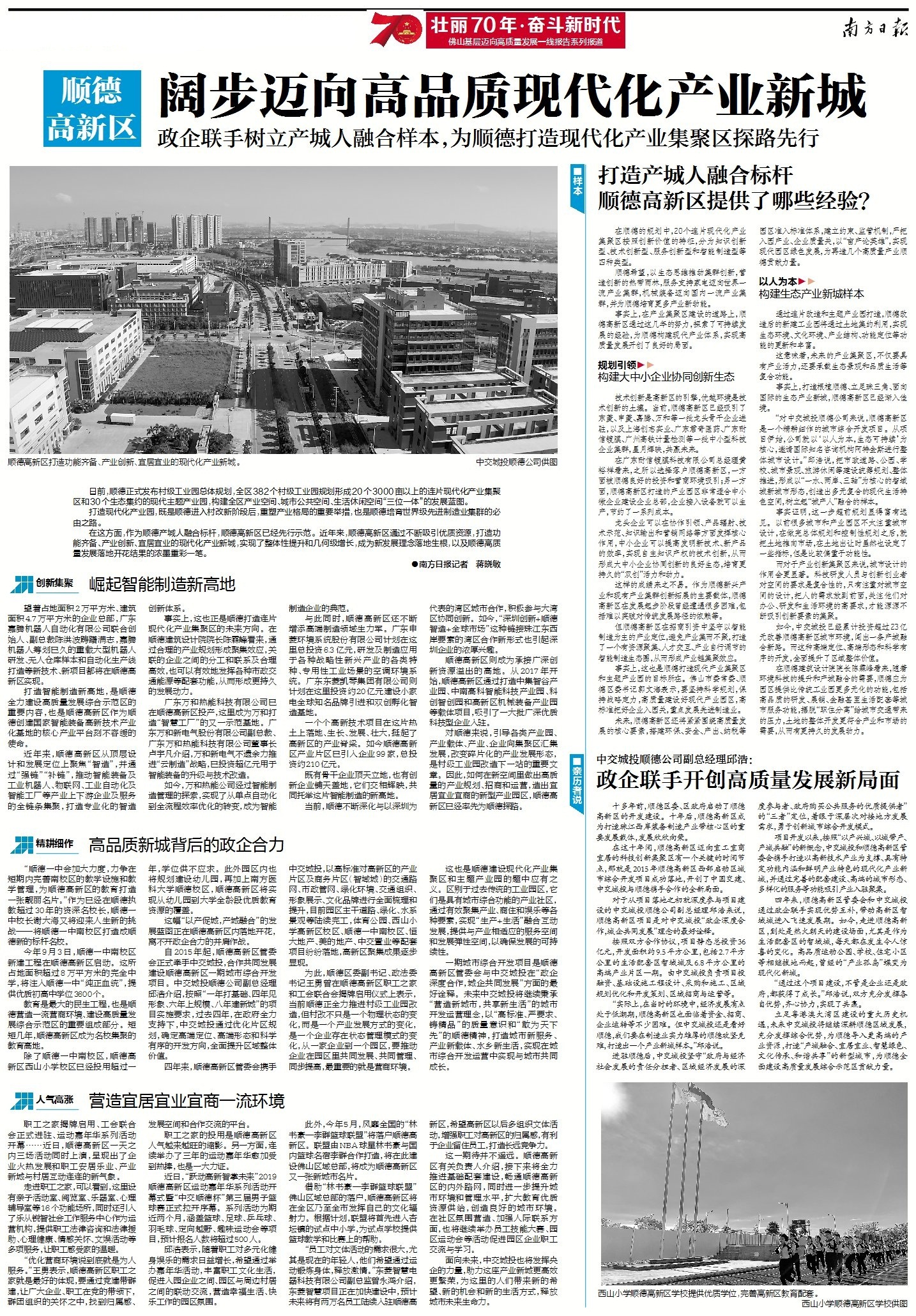 “对中交城投顺德公司来说,顺德高新区是一个精耕细作的城市综合开发项目。从项目伊始,公司就以‘以人为本,生态可持续’为核心,邀请国际知名咨询机构阿特金斯进行整体城市设计。”邱浩说,把市政道路、公园、学校、城市景观、旅游休闲等建设统筹规划、整体推进,形成以“一水、两岸、三轴”为核心的智域城新城市形态,创造出多元复合的现代生活特色空间,树立起“城产人”融合的样本。