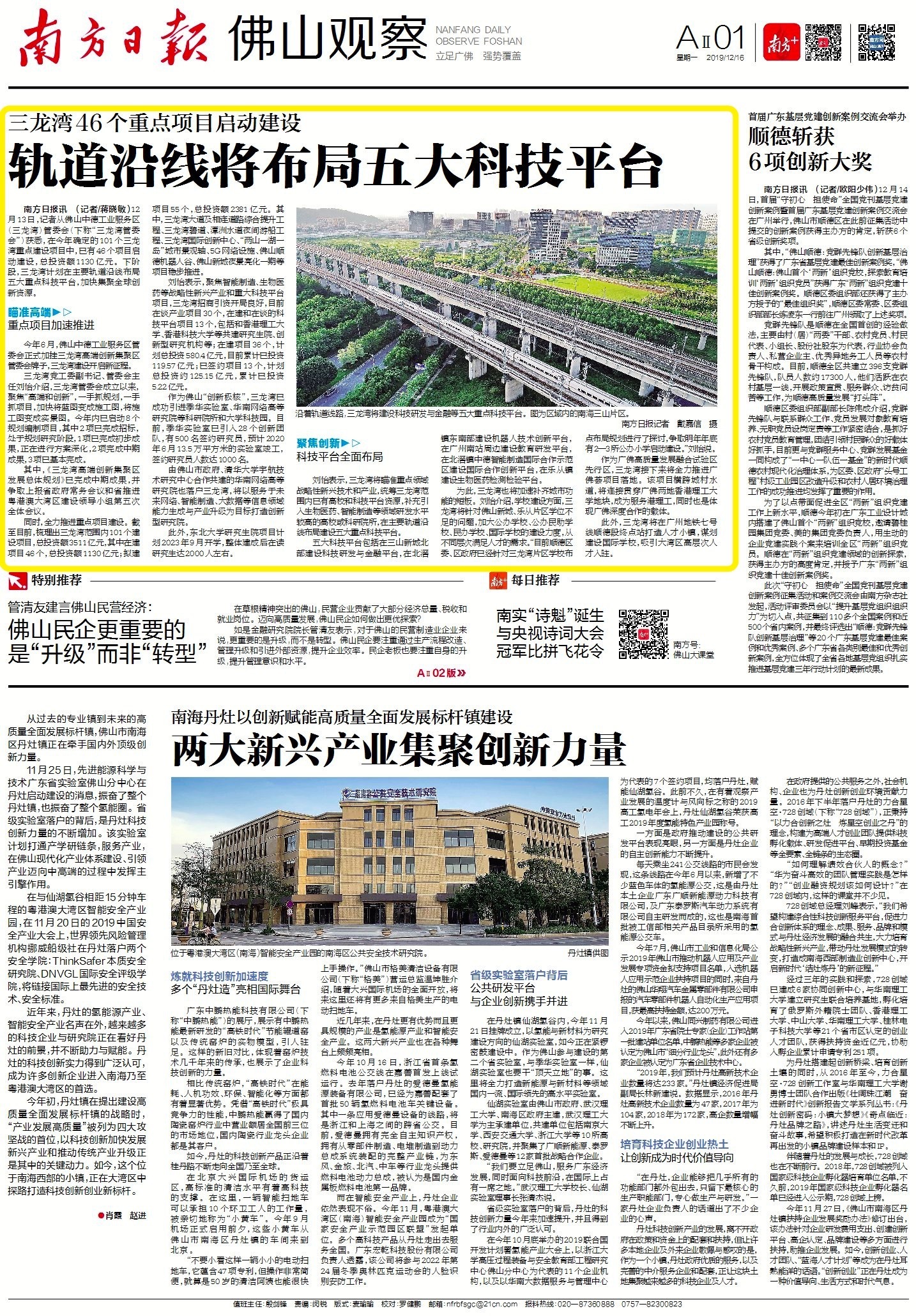 12月13日,记者从佛山中德工业服务区(三龙湾)管委会(下称“三龙湾管委会”)获悉,在今年确定的101个三龙湾重点建设项目中,已有46个项目启动建设,总投资额1130亿元。下阶段,三龙湾计划在主要轨道沿线布局五大重点科技平台,加快集聚全球创新资源。