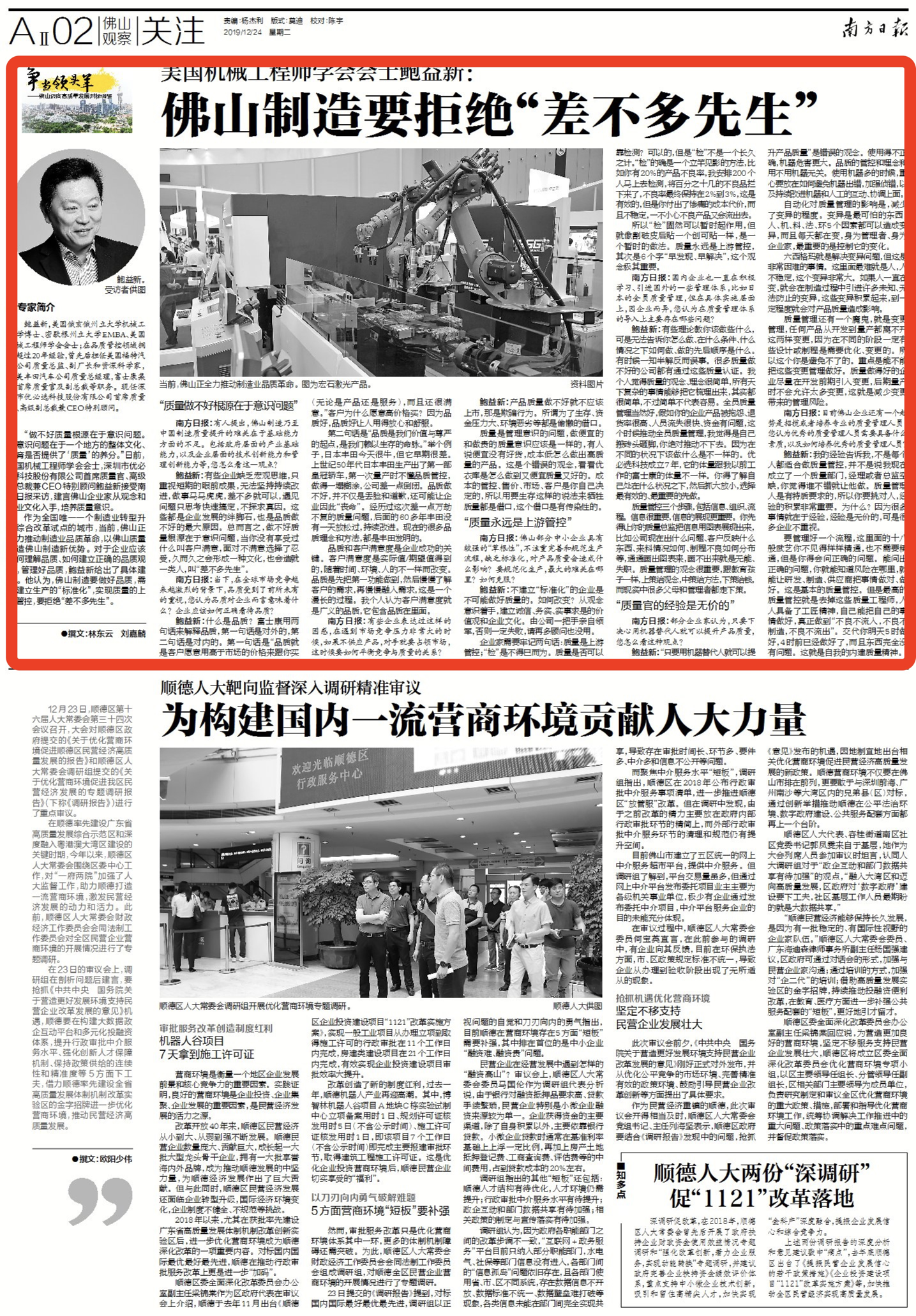 作为全国唯一一个制造业转型升级综合改革试点的城市,当前,佛山正全力推动制造业品质革命,以佛山质量铸造佛山制造新优势。对于企业应该如何理解品质、如何建立正确的品质观念,管理好品质,鲍益新给出了具体建议。他认为,佛山制造要做好品质,需要建立生产的“标准化”,实现品质的上游管控,要拒绝“差不多先生”。