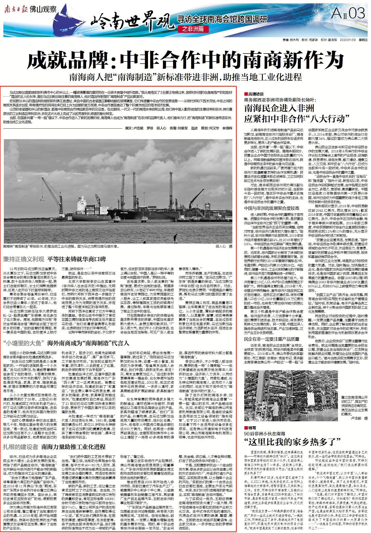当前,在国家共建“一带一路”倡议下,中非合作进入了新的发展阶段,南海商人也成为“南海制造”在非洲的品牌代言人,他们身体力行,把“南海制造”的新标准带进非洲,助推当地工业化进程。